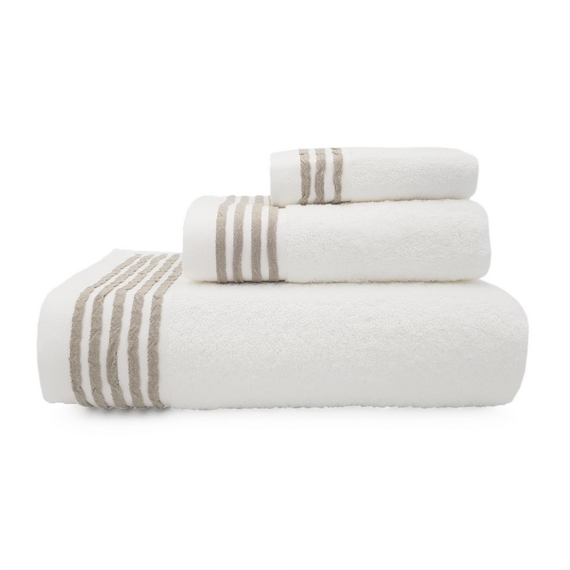 Profitez d'une touche de luxe et d'élégance dans votre salle de bain avec notre Ensemble de Serviettes Jacquard couleur blanche avec bordure en lin - coton relief beige, qui comprend trois tailles idéales pour répondre à tous vos besoins : une serviette de toilette, une serviette de lavabo et une serviette de bain. Avec un design Jacquard sophistiqué, cet ensemble de serviettes ne vous offre pas seulement un produit de haute qualité, mais aussi un style unique qui embellit votre salle de bain.