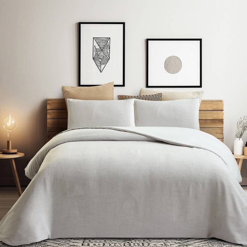 De bouti-sprei Veiga, met zijn textuur van voorgewassen linnen, biedt een natuurlijke en elegante stijl. De afwerking geeft een gevoel van zachtheid en comfort, ideaal om een warme en gezellige sfeer in je slaapkamer te creëren met een vleugje verfijning.